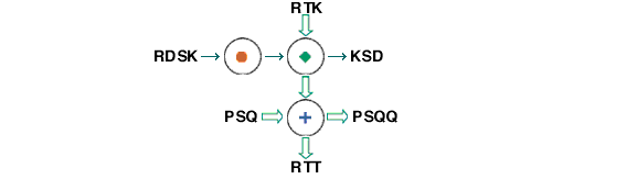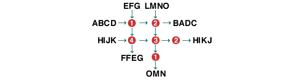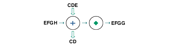 In this example, the diagram shows 'inputs' and 'outputs' in the large boxes. The 'operators' or 'processes' are shown in the small boxes. You need to determine what effect each of the 'operators' or 'processes' is having on the 'input' in order to produce the 'output' shown.